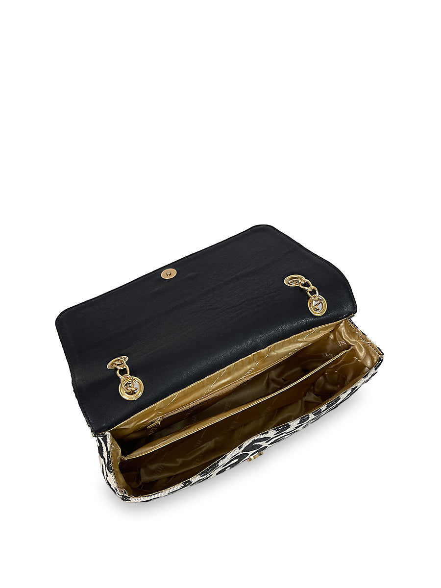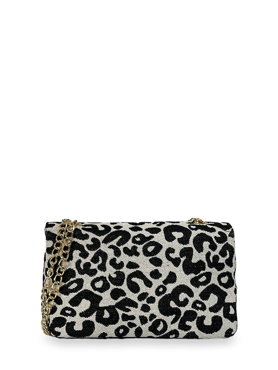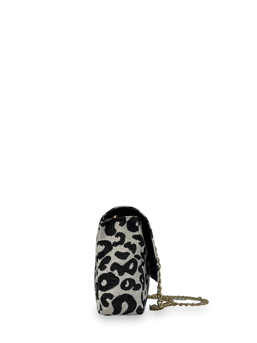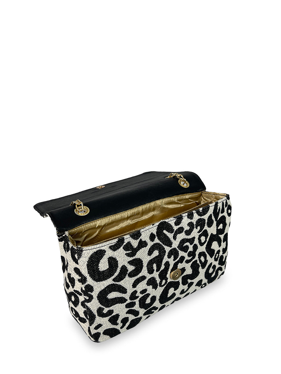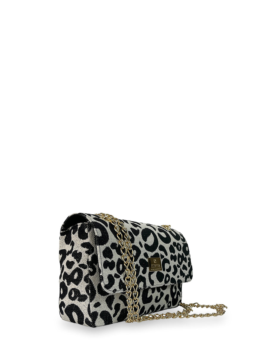 Γυναικεία τσάντα ώμου flap από τη σειρά Leopard από βαμβακερό ύφασμα. Διαθέτει λεπτομέρειες συνθετικού υλικού σε μαύρο χρώμα και χρυσές μεταλλικές λεπτομέρειες. Εντυπωσίασε με το style σου επιλέγοντας μία τσάντα από την σειρά Leopard.