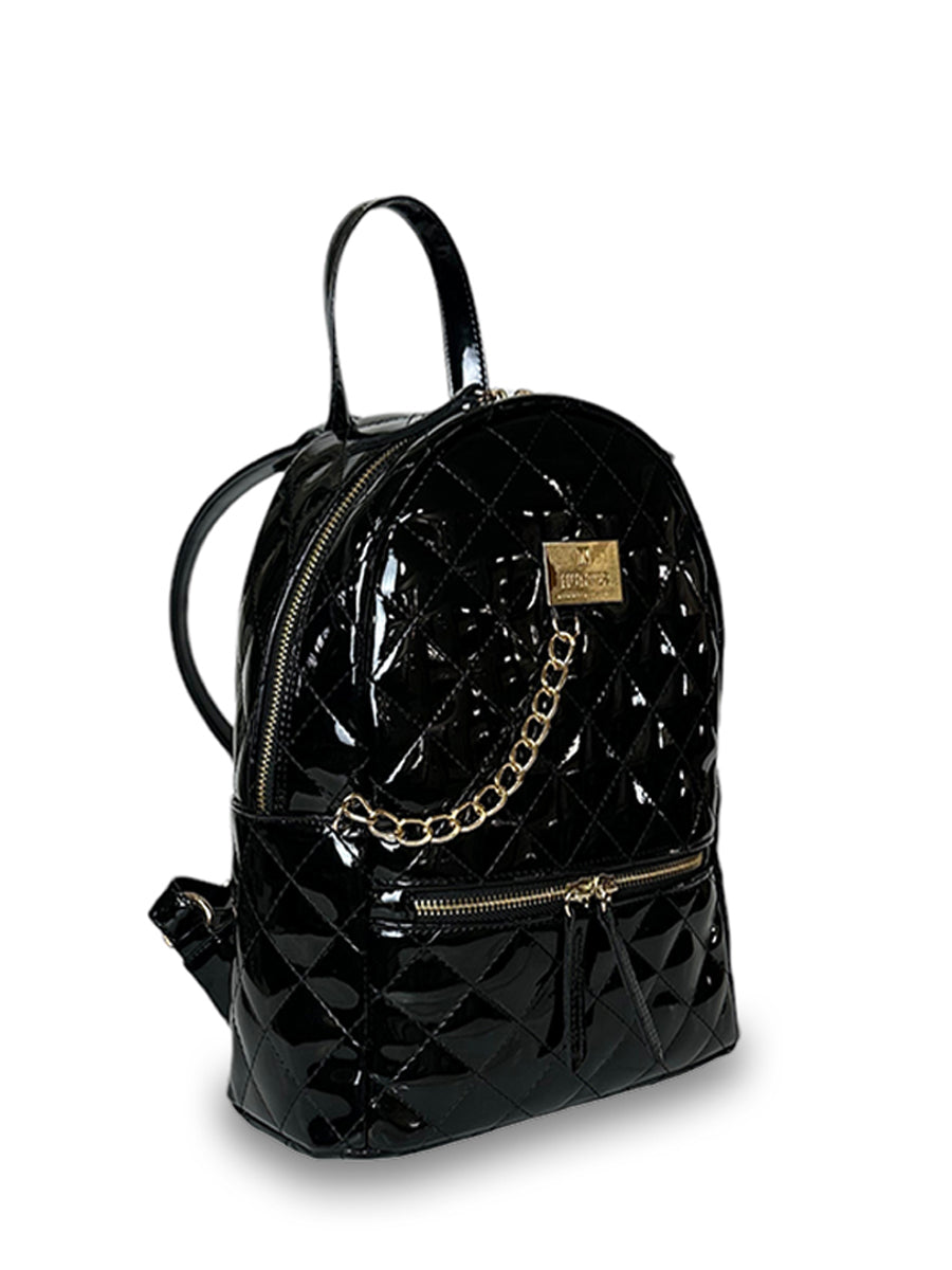Γυναικεία τσάντα πλάτης middle Quilted Μαύρο Λουστρίνι συνδυάζει πρακτικότητα και glam αισθητική. Το λουστρίνι καπιτονέ του δημιουργεί μοναδική υφή και φως, ενώ οι αλυσίδες προσθέτουν έναν ανεπιτήδευτα fashion-forward χαρακτήρα.
